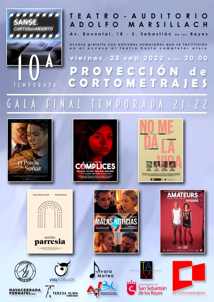 El viernes día 23 de septiembre, a partir de las 20:00, el Teatro Auditorio Adolfo Marsillach acogerá la última sesión de la temporada 2021-2022 de Sanse Cortos en Abierto. En ella se proyectarán los cortometrajes más votados por el público en cada una de las sesiones celebradas de noviembre de 2021 a mayo de 2022.