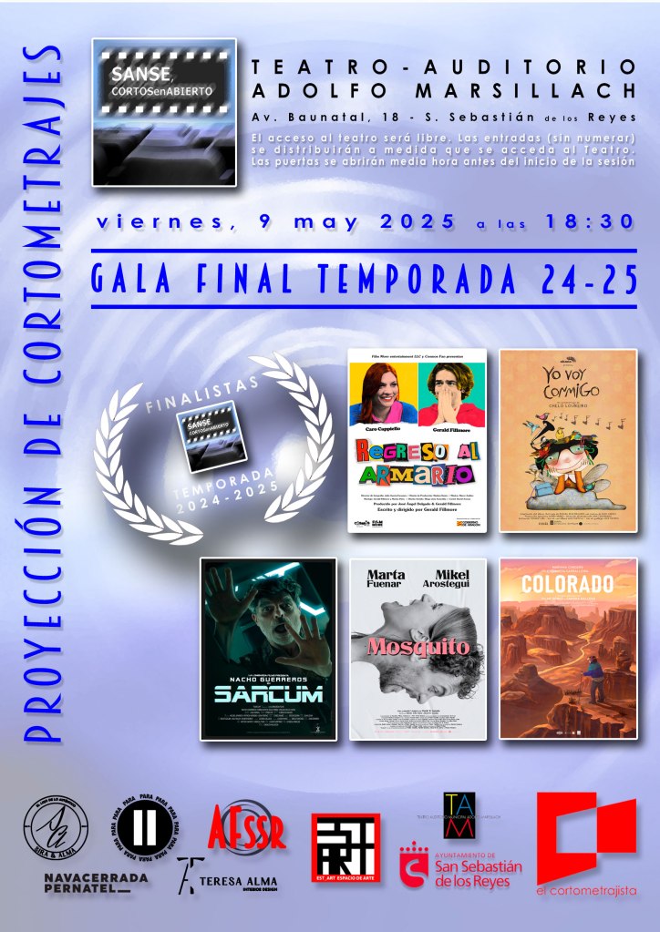 El viernes día 9 de mayo, a partir de las 18:30, el Teatro Auditorio Adolfo Marsillach de San Sebastián de los Reyes acogerá la última sesión de la temporada 2024-2025 de Sanse Cortos en Abierto. En ella se proyectarán los cortometrajes más votados por el público en cada una de las sesiones celebradas de noviembre de 2024 a abril de 2025.