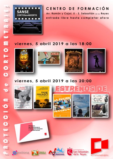 Dos programas, dos sesiones de Sanse Cortos en Abierto, una para público infantil a las 18:00 y otra a las 20:00 para el público habitual, para celebrar la 21ª Semana del Cortometraje de la Comunidad de Madrid. Ambas el viernes día 5 de abril.