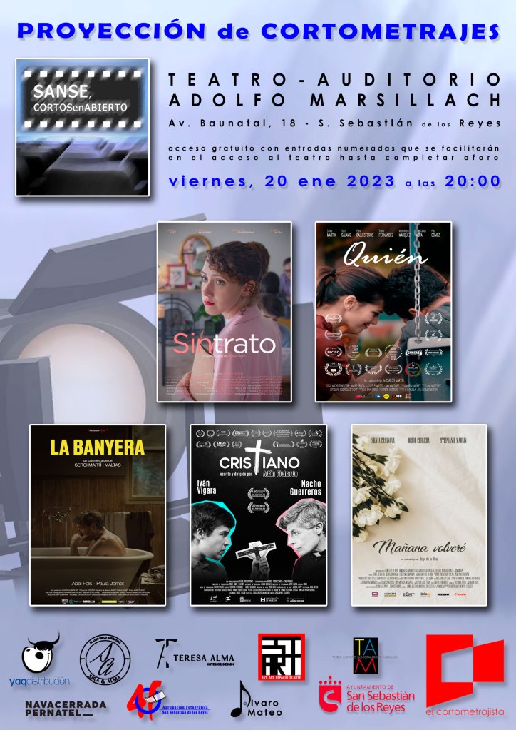 Cinco cortometrajes configurarán la primera sesión de Sanse Cortos en Abierto de 2023, la tercera de la temporada 2022-2023. Será el viernes día 20 de enero, festividad de San Sebastián, a partir de las 20:00 en el Teatro Adolfo Marsillach de San Sebastián de los Reyes.