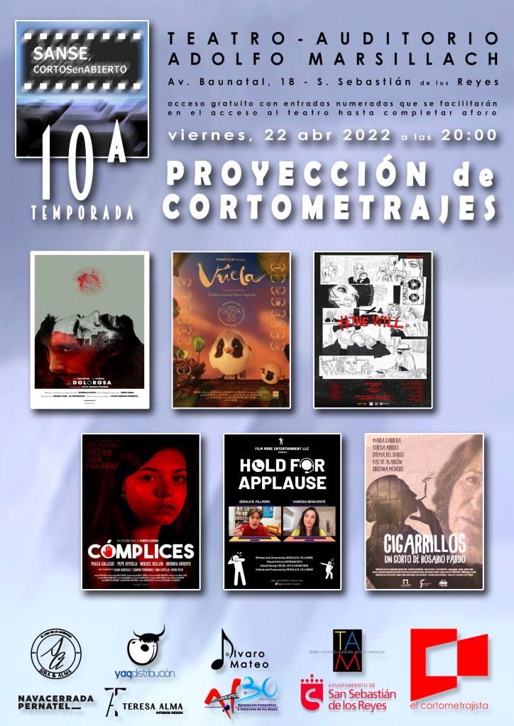Con producciones llevadas a cabo en los dos últimos años, los seis cortos programados para la sesión del viernes 22 de abril acaparan la friolera de casi 400 selecciones y 90 premios en distintos festivales tanto en España como fuera de nuestras fronteras. Será en el Teatro Adolfo Marsillach de San Sebastián de los Reyes a partir de las 20:00. Como siempre, el acceso a la sesión será gratuito. Las entradas, numeradas, se distribuirán en el TAM desde una hora antes del inicio de la sesión.