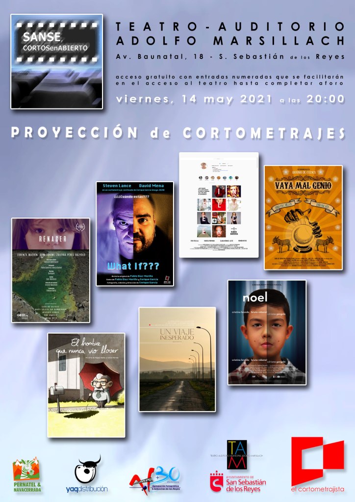 El viernes 14 de mayo, el Teatro Adolfo Marsillach acogerá la sexta sesión de la temporada 2020-2021 de Sanse Cortos en Abierto. Con esta sesión se completarán las seis sesiones clasificatorias de la temporada y quedará configurado, con el cortometraje que resulte ganador, el cartel de cortos finalistas en busca del Premio del Público al mejor corto de la temporada de Sanse Cortos en Abierto. La sesión arrancará a las 20:00.