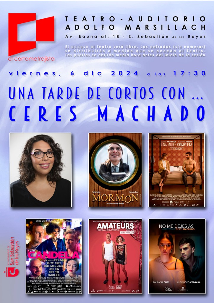 Para la Tarde de Cortos con … del viernes día 6 de diciembre a las 17:30 en el Teatro Adolfo Marsillach de San Sebastián de los Reyes, serán hasta cinco cortos de Ceres Machado los que configuren la proyección y será con ella con quien se mantendrá el coloquio posterior.