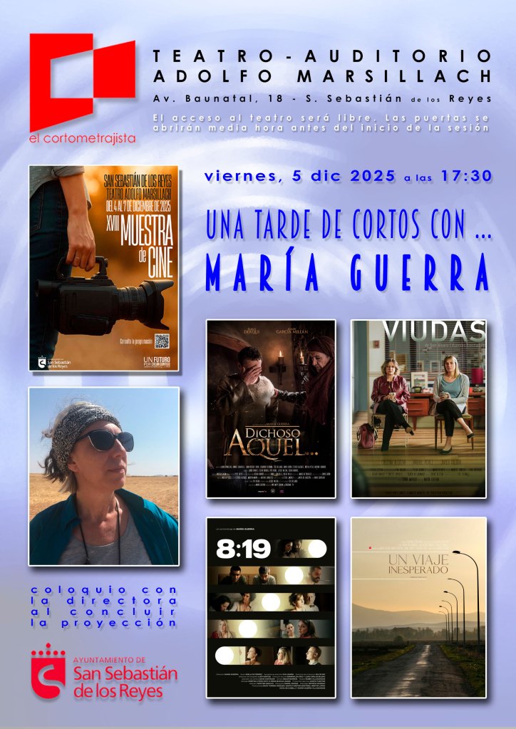 Para la Tarde de Cortos con … del viernes día 5 de diciembre a las 17:30 en el Teatro Adolfo Marsillach de San Sebastián de los Reyes, serán cuatro cortos de María Guerra los que configuren la proyección y será con ella con quien se mantendrá un coloquio al finalizar la proyección.